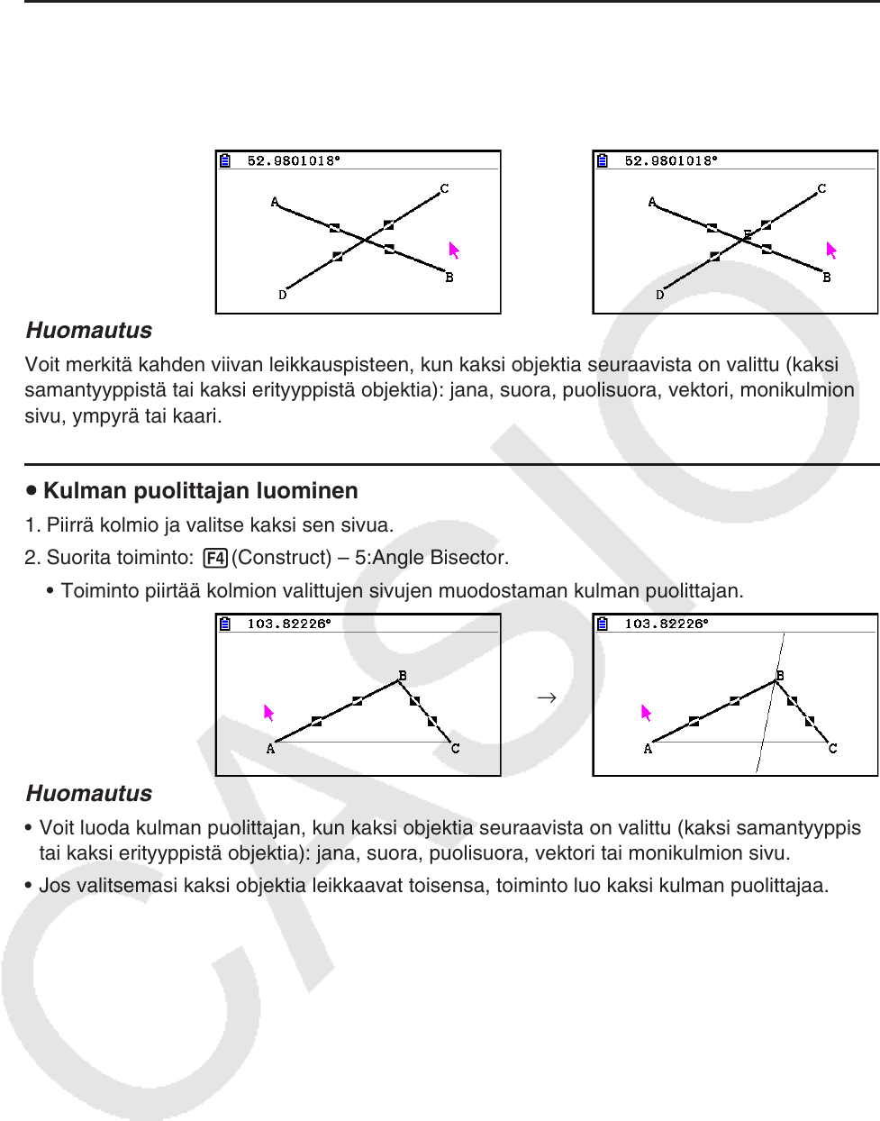 • Voit luoda kulman puolittajan, kun kaksi objektia seuraavista on valittu (kaksi samantyyppistä