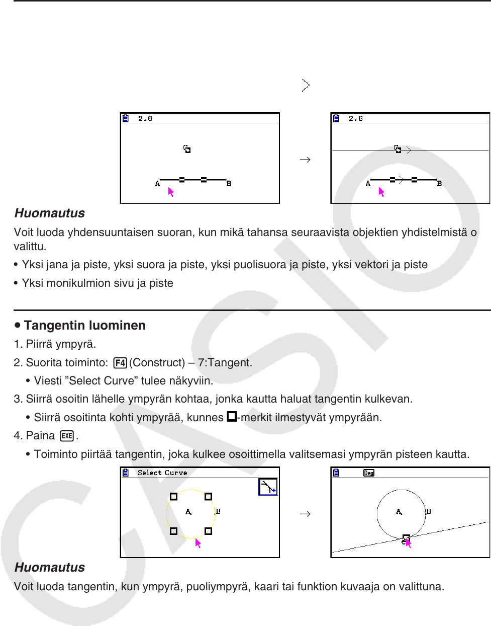 Voit luoda tangentin, kun ympyrä, puoliympyrä, kaari tai funktion kuvaaja on valittuna.