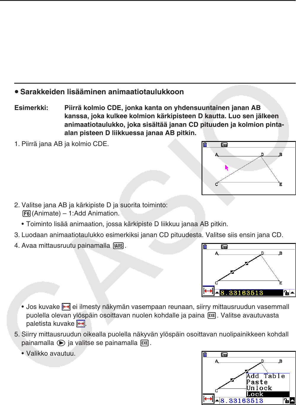 • Toiminto lisää animaation, jossa kärkipiste D liikkuu janaa AB pitkin.