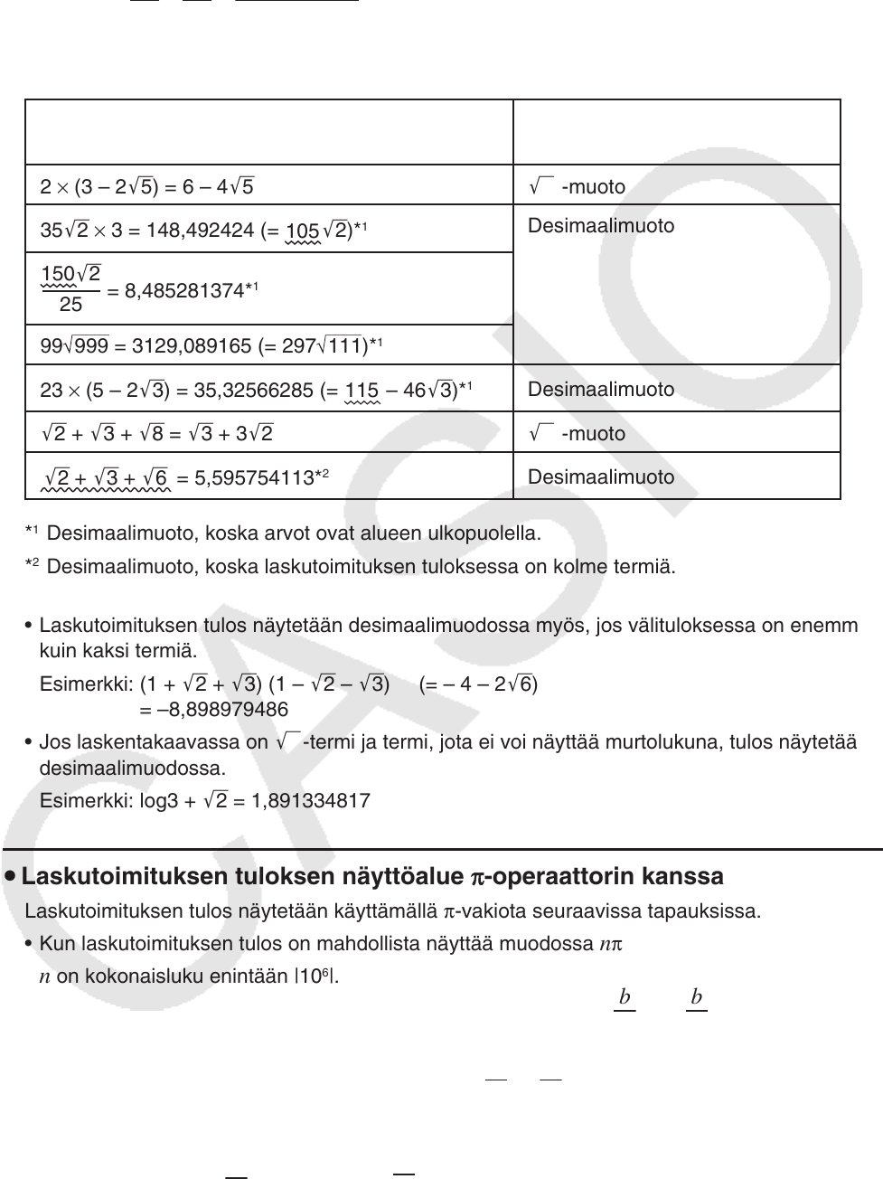 Laskutoimituksen tulos näytetään käyttämällä π-vakiota seuraavissa tapauksissa.