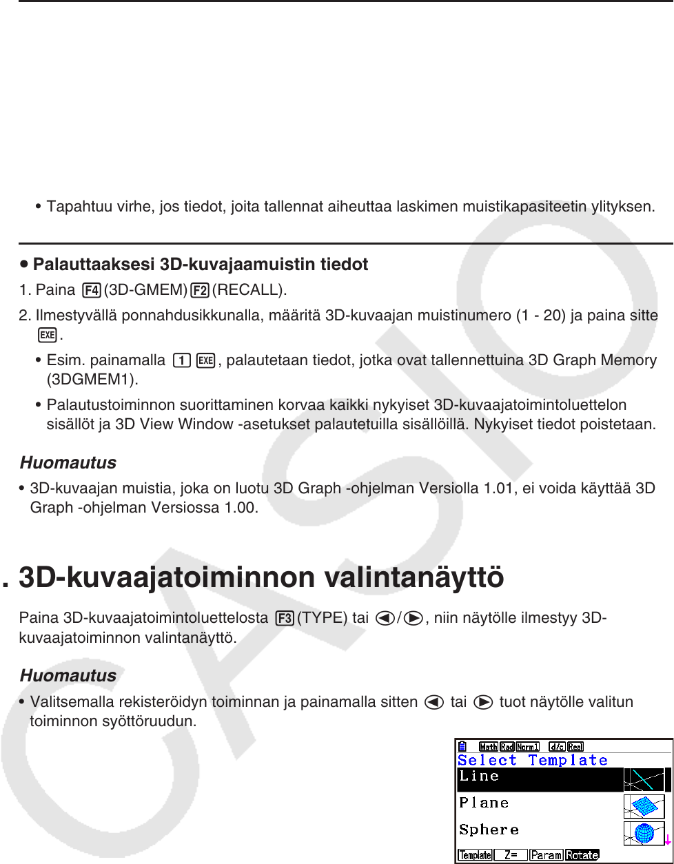 • 3D-kuvaajan muistia, joka on luotu 3D Graph -ohjelman Versiolla 1.01, ei voida käyttää 3D