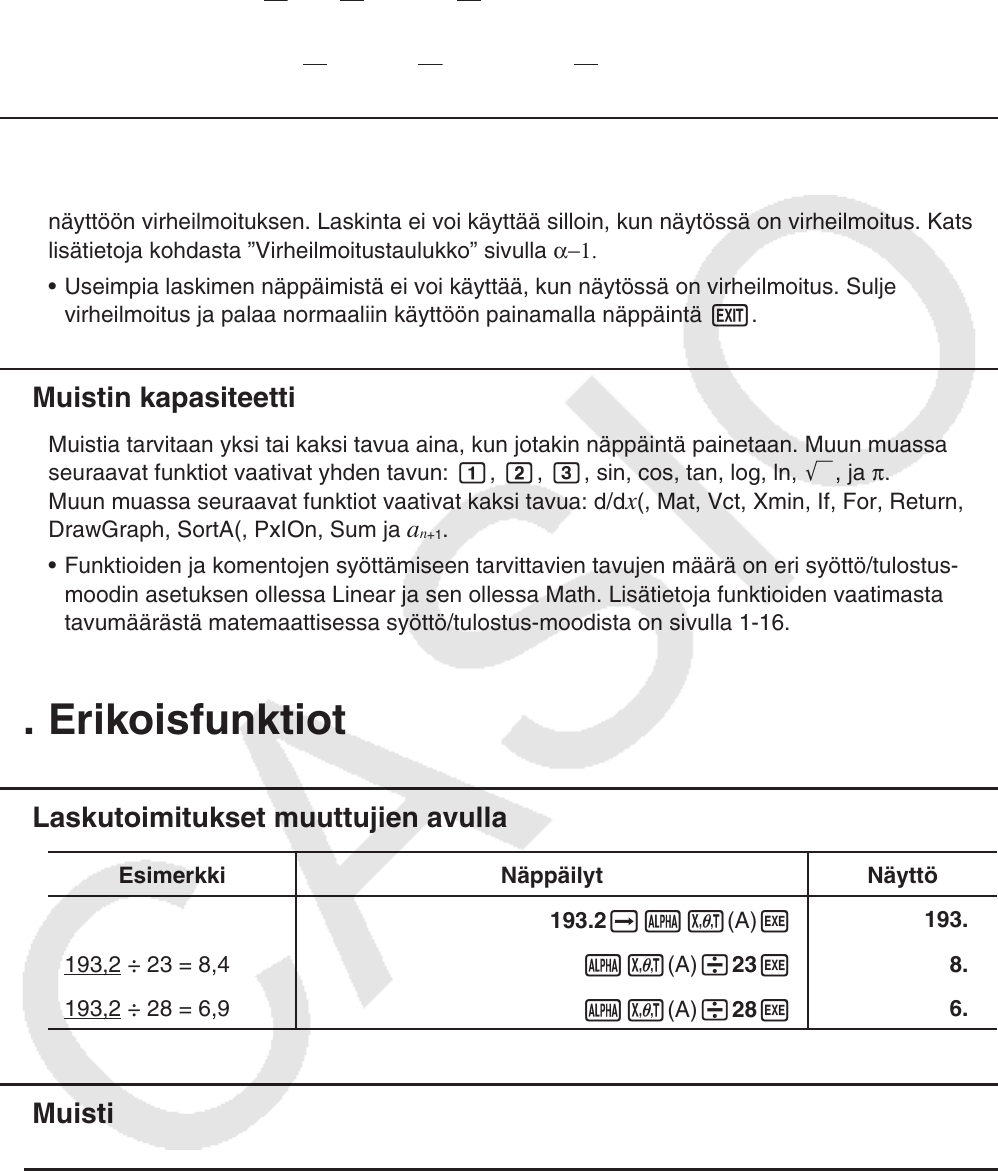 • Useimpia laskimen näppäimistä ei voi käyttää, kun näytössä on virheilmoitus. Sulje
