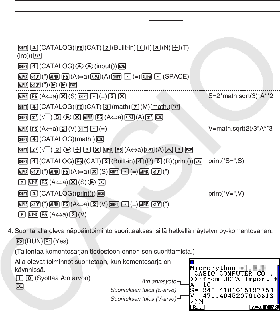 4. Suorita alla oleva näppäintoiminto suorittaaksesi sillä hetkellä näytetyn py-komentosarjan.
