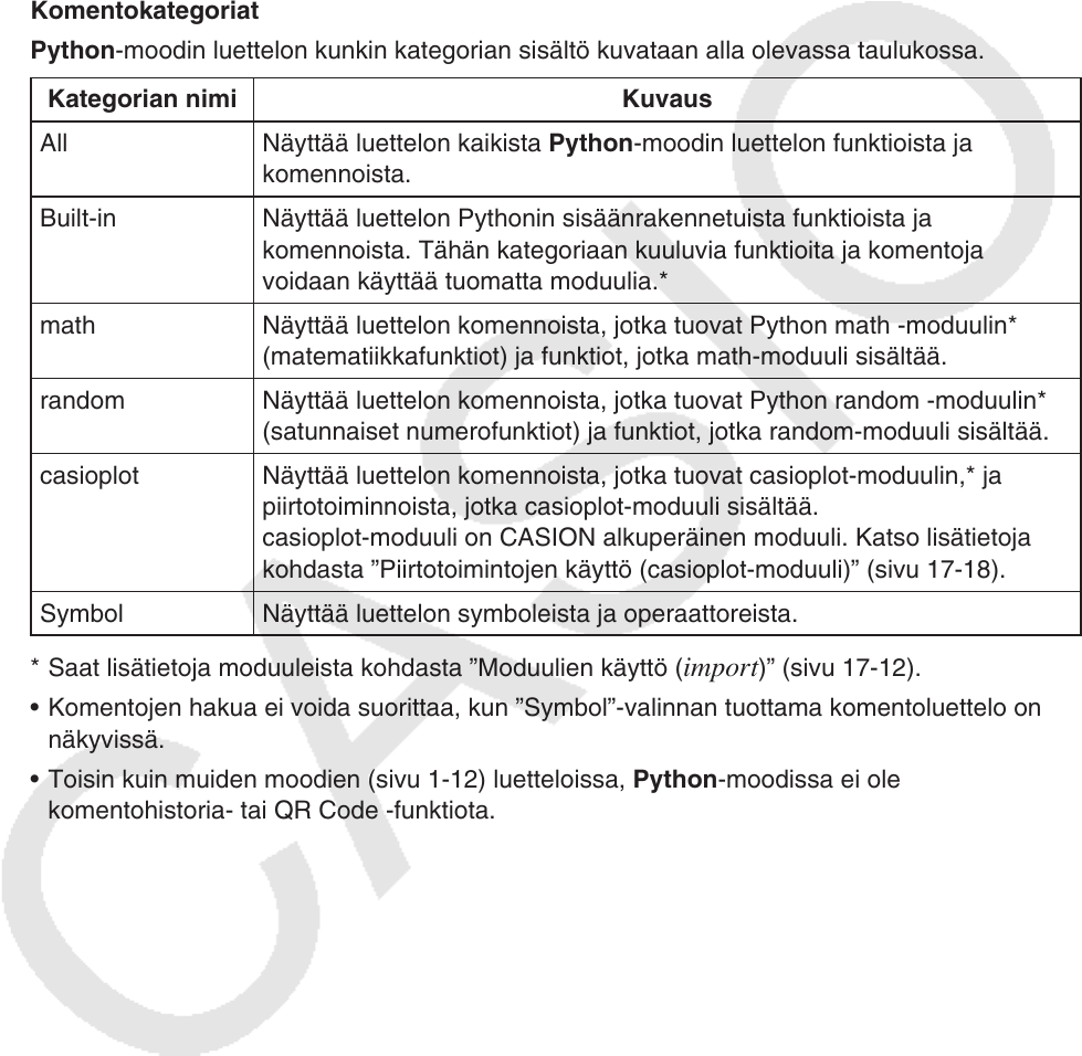 • Toisin kuin muiden moodien (sivu 1-12) luetteloissa, Python-moodissa ei ole