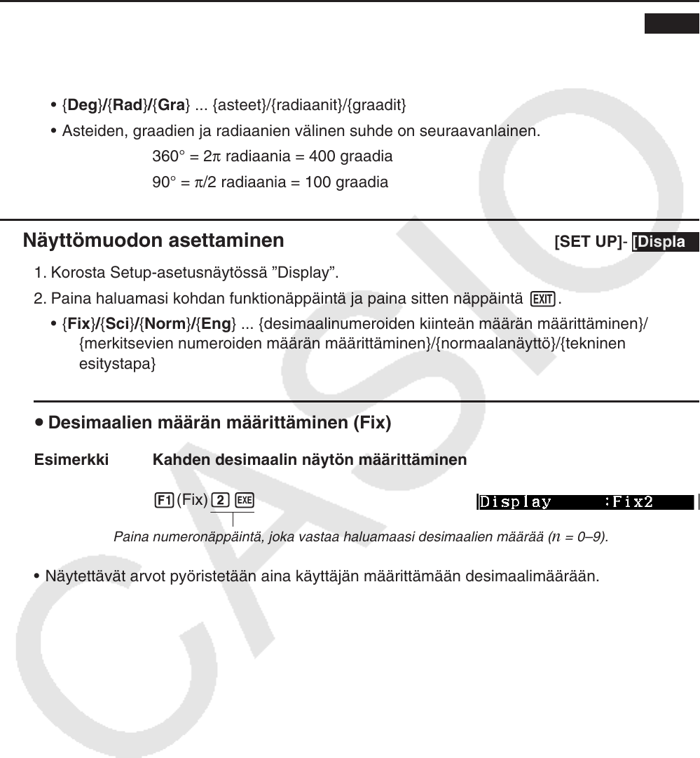 • {Fix}/{Sci}/{Norm}/{Eng} ... {desimaalinumeroiden kiinteän määrän määrittäminen}/