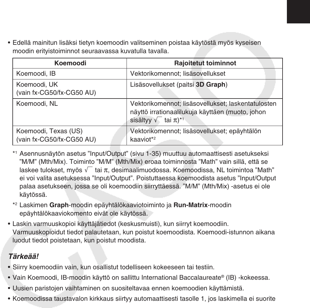 Koemoodit rajoittavat laskimen toimintoja, jolloin sitä saa käyttää kokeissa tai testeissä.