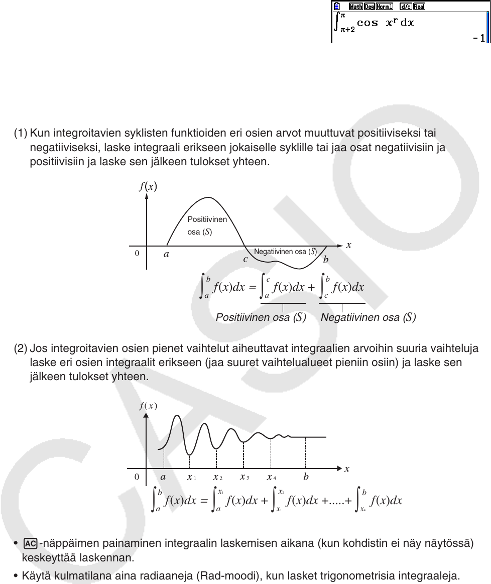 • Käytä kulmatilana aina radiaaneja (Rad-moodi), kun lasket trigonometrisia integraaleja.