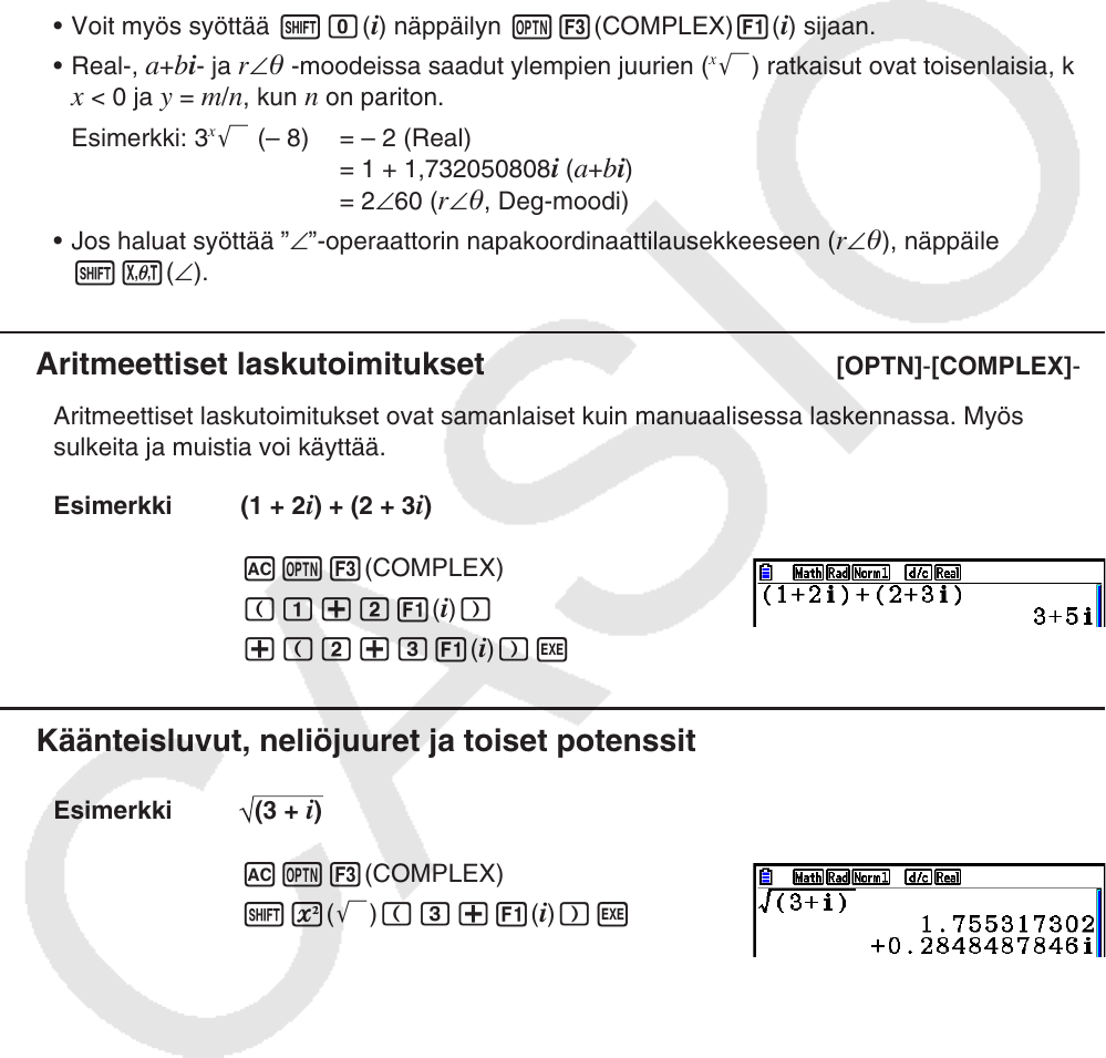 k Aritmeettiset laskutoimitukset [OPTN]-[COMPLEX]-[i]