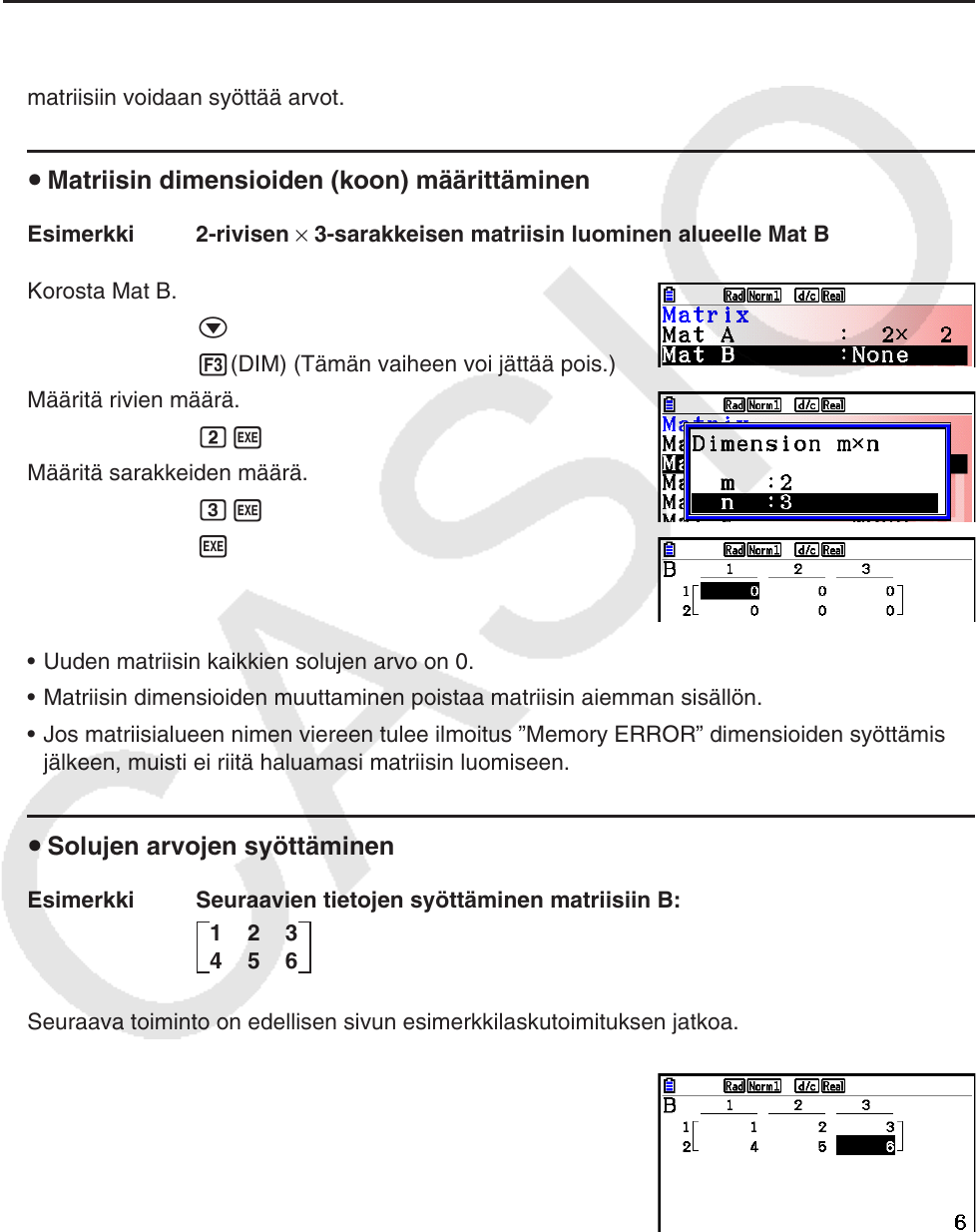 • Jos matriisialueen nimen viereen tulee ilmoitus ”Memory ERROR” dimensioiden syöttämisen