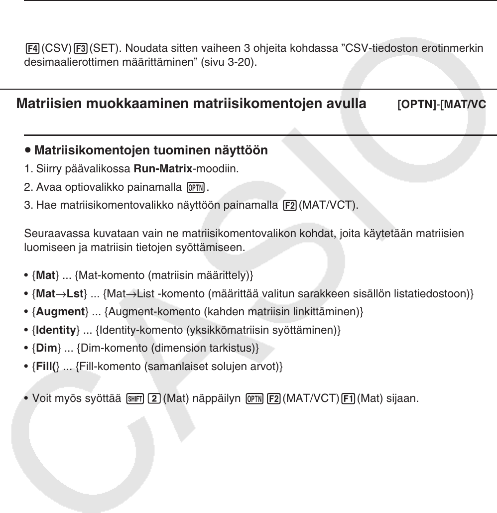 k Matriisien muokkaaminen matriisikomentojen avulla [OPTN]-[MAT/VCT]