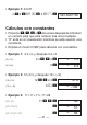 • Ejemplo 7: 4/3π53 4\3-A x-5 AN= 523.5987756 Cálculos con constantes • Presione +, ,, - o \ dos veces después de introducir un número para que este número sea una constante. • “K” está en el visualizador mientras se está usando una constante. • Emplee el modo COMP para cálculos con constantes. • Ejemplo 1: 2,3 3, y después 2,3 6 (2,3 3) 2.3 + + 3 = K 5.3 (2,3 6) 6= K 8.3 12 - - 2.3 = K 27.6 9E= K –108. 17 + + = K 34. (17 17 17) = K 51. (17 17 17 17) = K 68.