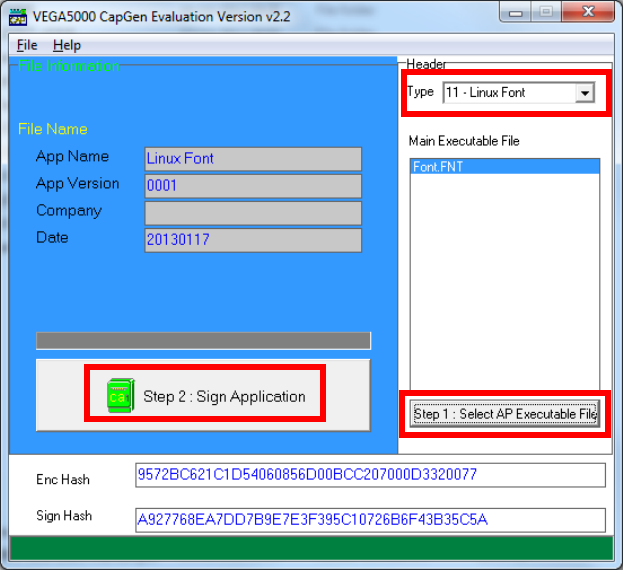 Set type to [11 – Linux Font], press [Step 1] button select the FNT file. Then
