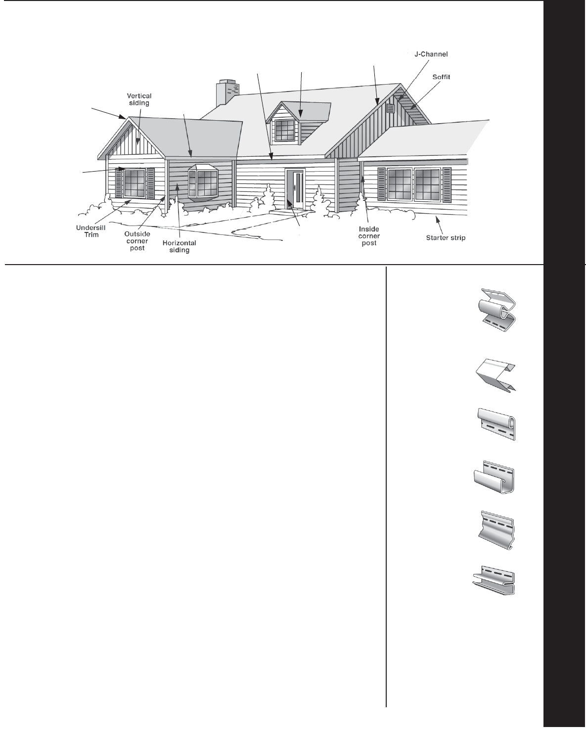 Posts, Starter Strips, F-Channels, Undersill Trim, and J-Channels (left). Each of these
