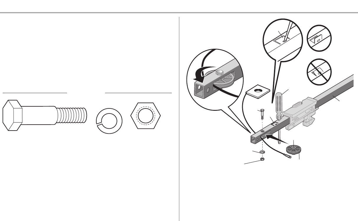 4. Insertthe idler bolt from the top through the rail and pulley.Tighten with a 3/8" lock washer and