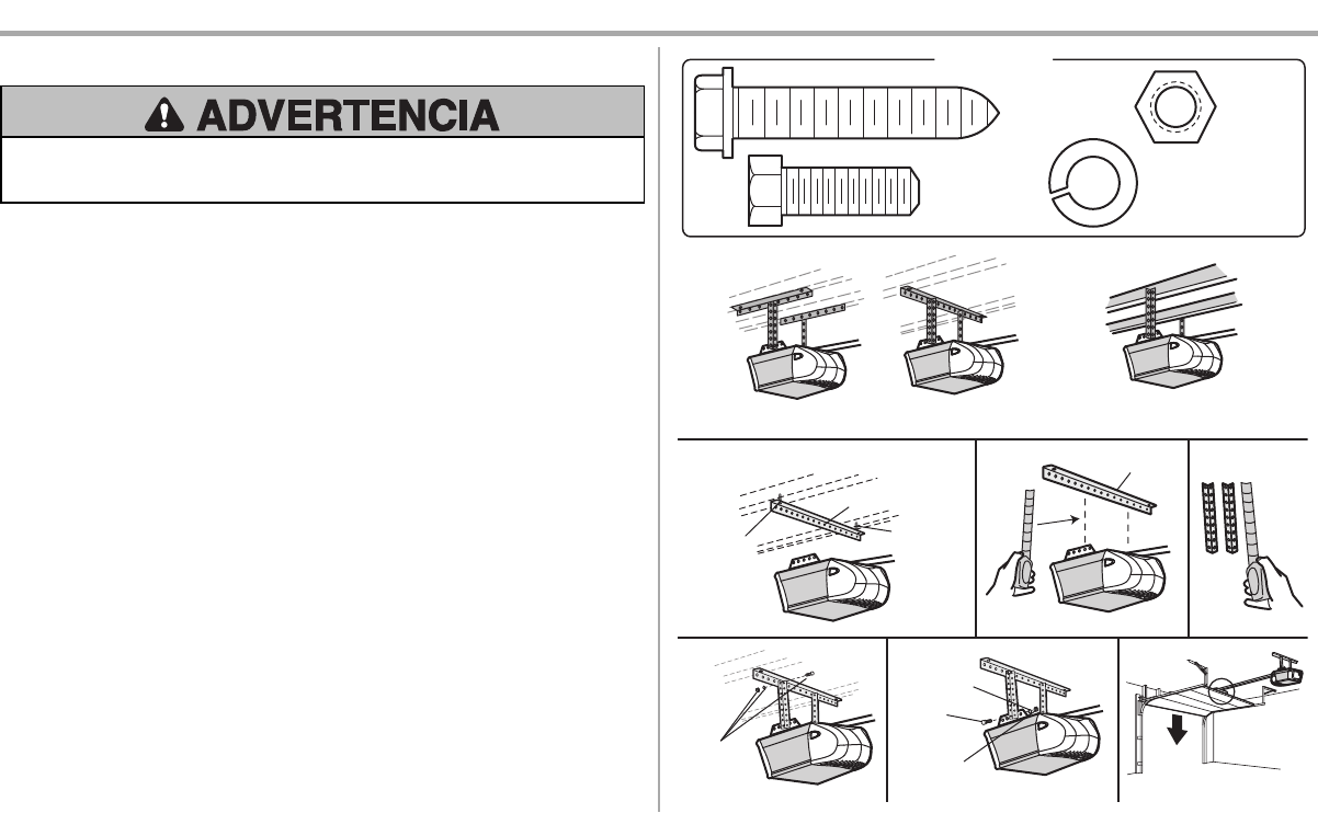 5. Fije el abre-puertas de garaje a las ménsulas colgantes con pernos, arandelas de presión y tuercas.