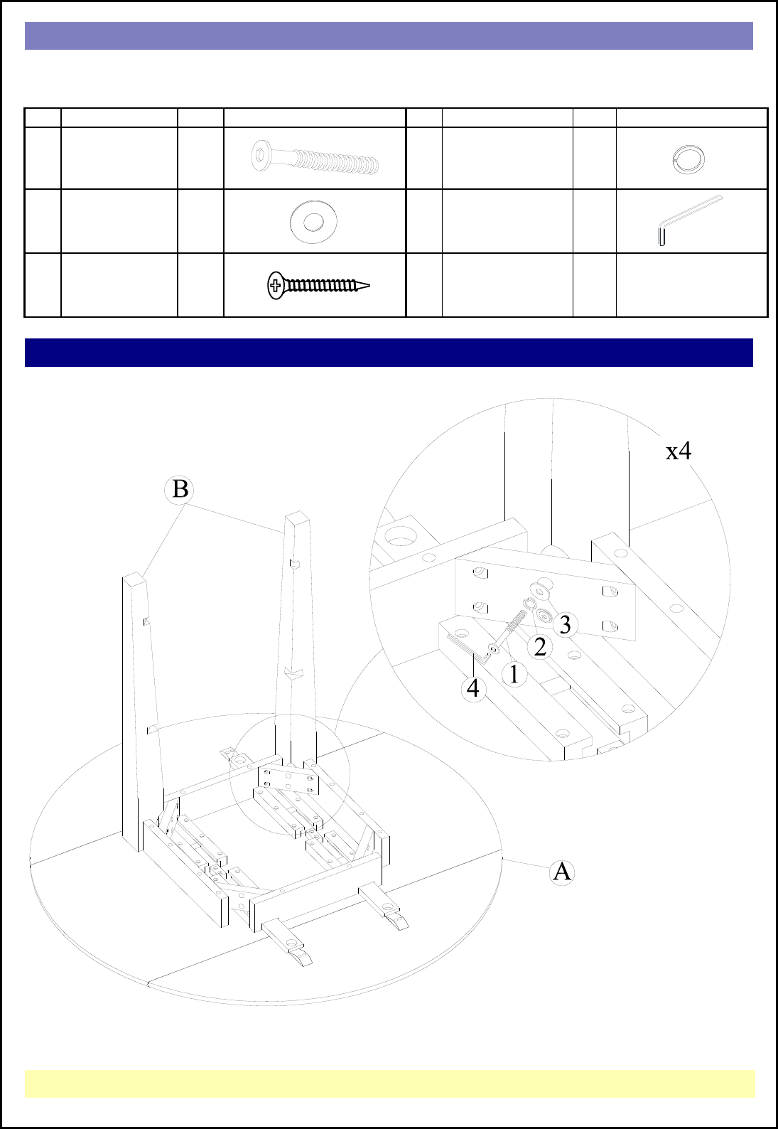Attach two legs (B) to the top (A) with Bolts (1) and washers (2), (3). Tighten with the Allen Key (4).