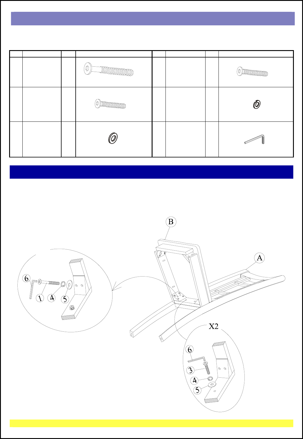 Attach frame (B) to the back (A) by using bolts (3) and (1) and washers (4) and (5). Tighten with Allen