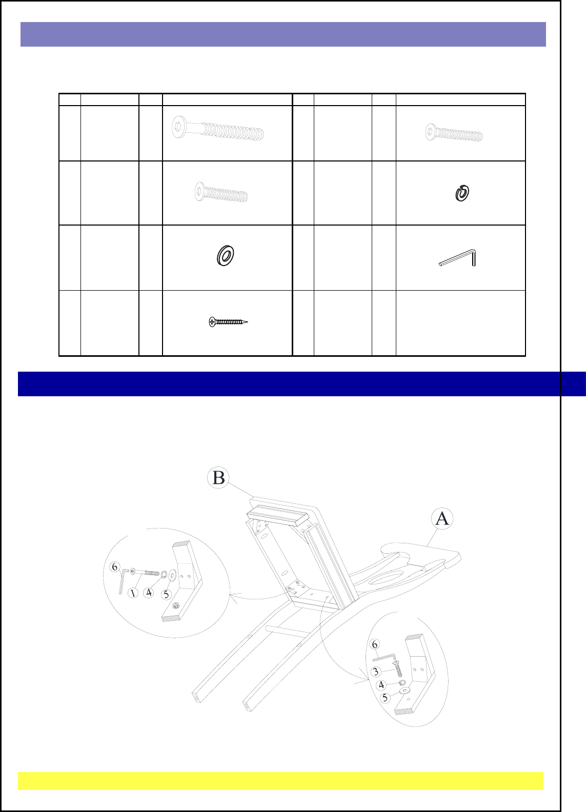 Attach frame (B) to the back (A) by using bolts (3) and (1) and washers (4) and (5). Tighten with Allen