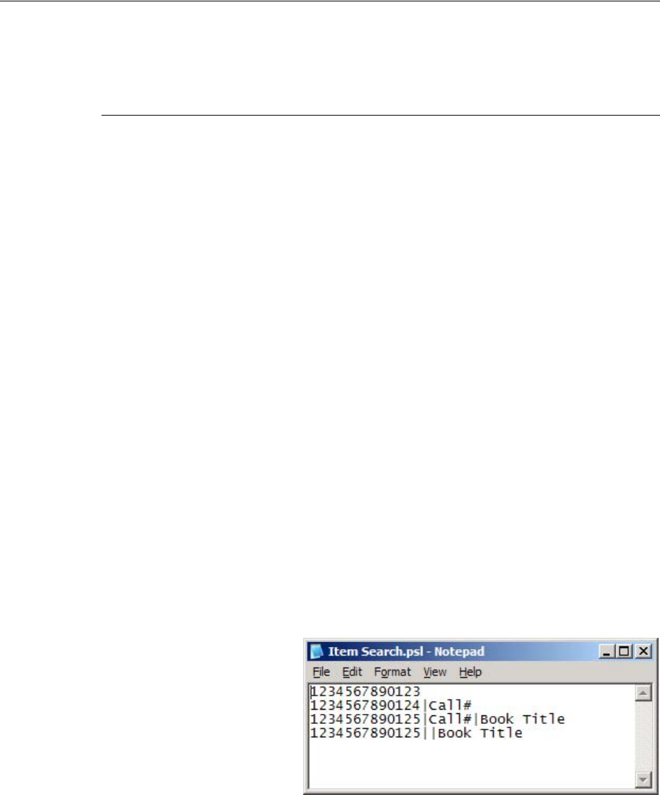 An Item Search List file contains the barcodes you wish to find. The file uses the .psl file