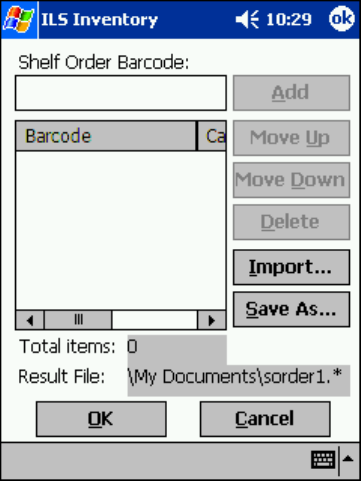 1 From the main screen of ILS Inventory, tap Shelf Order. The Shelf Order window