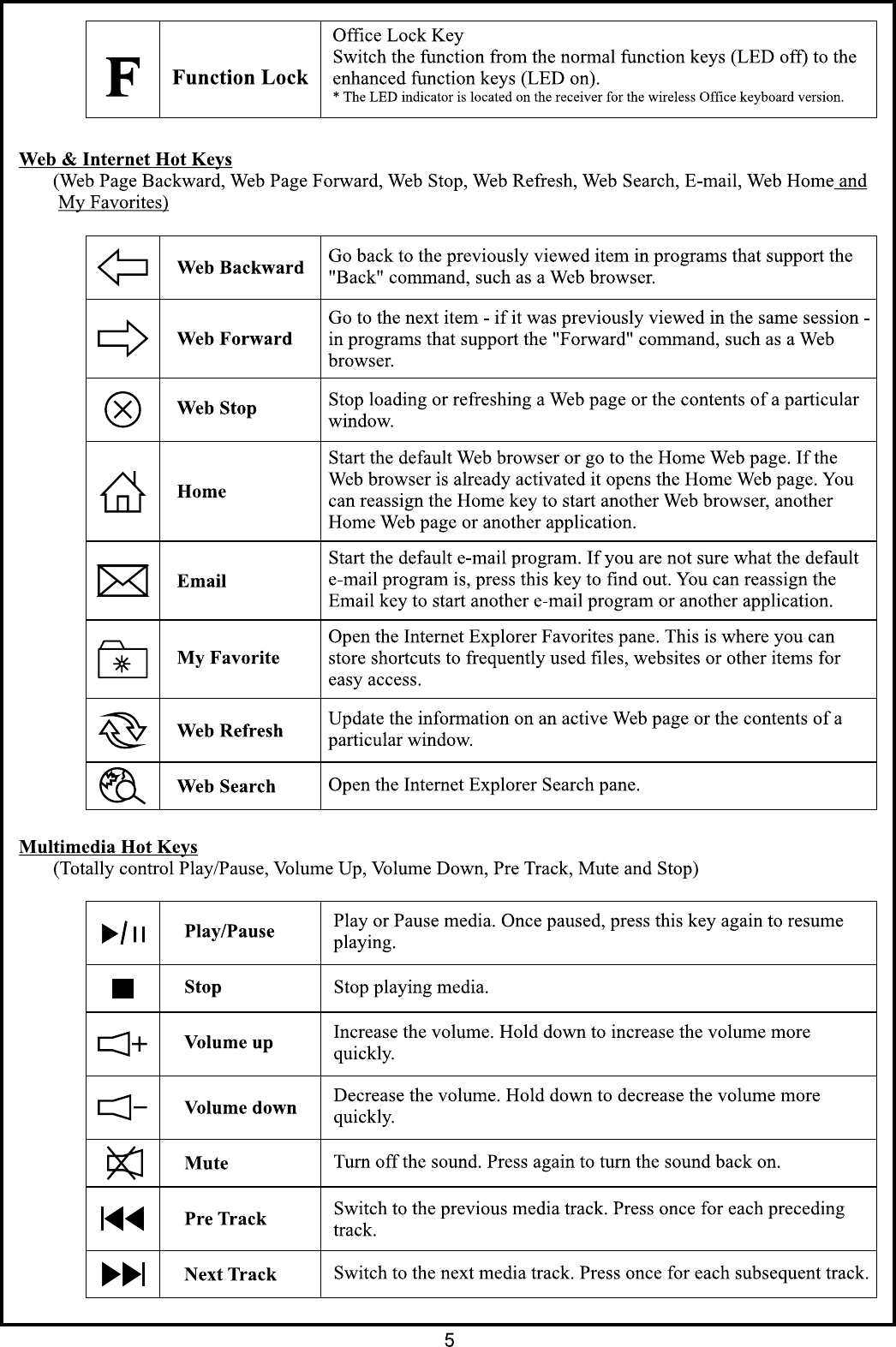 F Function Lock Office Lock Key Switch the function from the normal function keys (LED off) to the enhanced function keys (LED on). * The LED indicator is located on the receiver for the wireless Office keyboard version. Web & Internet Hot Keys {Web Page Backward, Web Page Forward, Web Stop, Web Refresh, Web Search, E-mail, Web Home and My Favorites) Go back to the previously viewed item in programs that support the & Web Backward "Back" command, such as a Web browser.