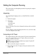 2. Press the power button. 3. Each time the computer is turned on, it performs a Power-On Self Test (POST), and the operating system such as Windows should start. Turning Off To turn off the computer power, use the “Shut Down” command of your operating system. NOTE: There are other ways you can stop the computer so that you will be back to where you left off when you next turn on the computer. (See “Stopping the Computer” in Chapter 2 for information.
