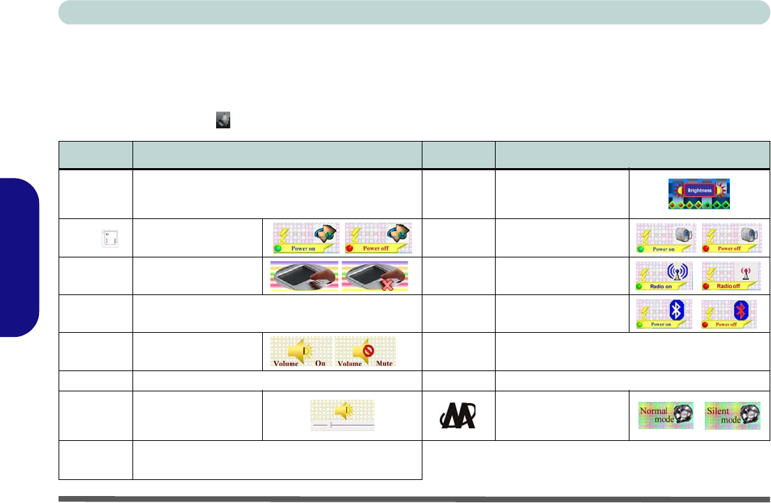 touche Fn appuyée. En plus des combinaisons des touches de fonction de base, les indicateurs visuels sont disponibles