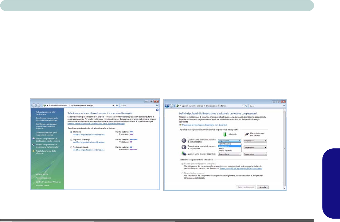 Il pannello di controllo delle Opzioni risparmio energia (menu Hardware e suoni) di Windows (vedere la pagina 187)