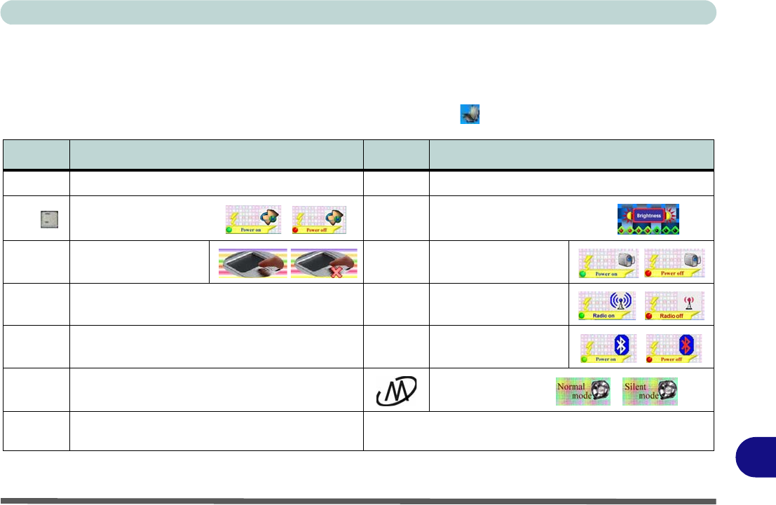 basic function key combinations; visual indicators (see the table below) are available when the hot key utility is in-