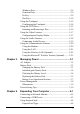 Preface This manual contains information that will help you operate the computer. It is divided into 8 chapters, 2 appendices, and an index. z Chapter 1, Getting Started, takes you through the process of setting up the computer and identifying its external components. z Chapter 2, Operating Your Computer, tells you how to use the computer’s components and features. z Chapter 3, Managing Power, provides information on power.