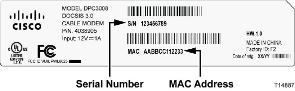 The Serial Number (S/N) of the cable modem. The serial number consists of a