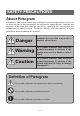 SAFETY PRECAUTIONS About Pictogram Precautions and notices necessary to follow for preventing hazards to the user or other person or their properties are defined as shown below. Hazards and degrees of damage that may be caused by ignoring the instructions are categorized as shown below. Please be familiar with the content of these definitions before reading this manual. Danger Indicates the case that may result in death or serious injury.