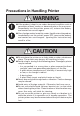 Precautions in Handling Printer WARNING ● If the product is kept in use under abnormal condition such as generation of heat, smoke, or abnormal odor, a fire may occur. Immediately turn the printer power off, remove the battery, and contact our service agent. ● If any foreign matter (metal tip, water, liquid) enters the product, immediately turn the printer power OFF, remove the battery, and contact our service agent. Ignoring this instruction may result in a fire.
