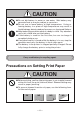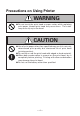 Precautions on Using Printer WARNING ● Do not touch the print head or paper cutter while replacing print paper. Heated print head may cause burn. The cutter may cause injury to the hand. CAUTION ● Use of print paper other than specified may result in not only deteriorated print quality but shortened life of print head (printing portion). ● Do not tap or rub the print head with edged or hard material. ● When dew condensation is present on the print head, dry it completely before printing.