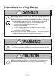 Precautions on Using Battery DANGER ● Entering battery liquid may result in loss of eyesight. Immediately wash eyes with fresh water and get medical care. ● Keep the following in mind when handling battery. Otherwise, liquid leakage, heat generation, and explosion may result. • Do not throw battery into fire or do not apply heat. • Do not peel or scratch the external tube. • Soldering is prohibited. • Do not give strong shock to battery or throw it away.