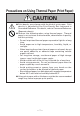 Precautions on Using Thermal Paper (Print Paper) CAUTION ● Print density may change with the kind of print paper. Print density is adjusted by the Print Density Set command in Command Reference. For details, refer to Command Reference (Separate sheets). ● Observe the following when using thermal paper. Thermal paper is not resistant to discoloration, deterioration in quality, and thin printing. • Do not let printed thermal paper exposed to light for a long time.