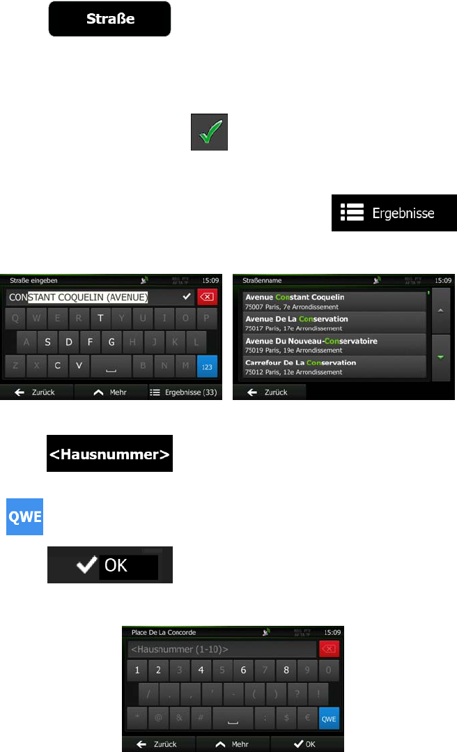 • Der am ehesten zutreffende Straßenname wird immer im Eingabefeld angezeigt.