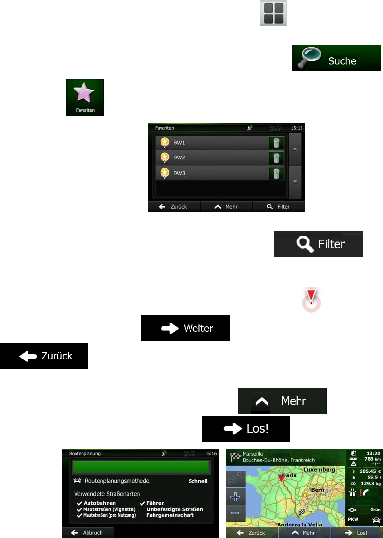 Sie können einen Ort als Ziel wählen, den Sie bereits in Ihren Favoriten gespeichert haben. Auf Seite 68