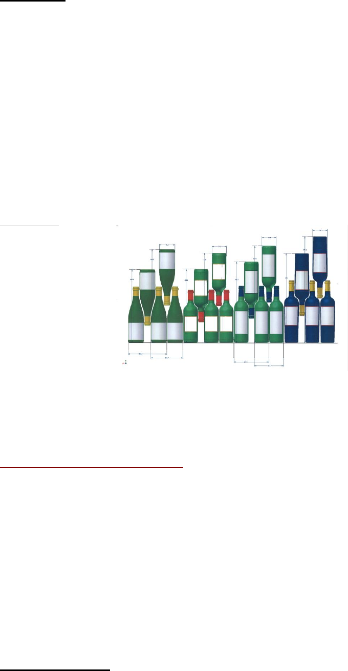 We zien hier 4 soorten flessen van 75 cl, bourgogneflessen en bordelaises, in verschillende groottes.