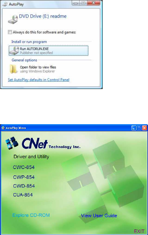 - There will be a Vista AutoPlay Confirm Window. Click Run AUTORUN.EXE icon.