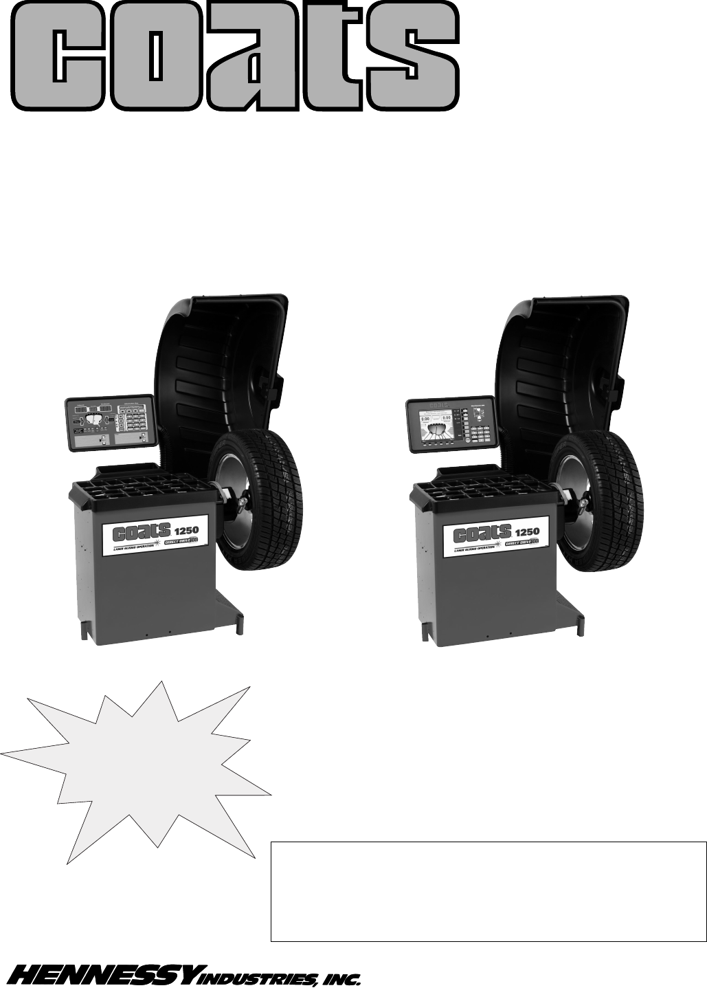 ® 1250 2D/3D/3DV Wheel Balancers See ¨Balancing Your First Tire on page 1. Installation Operating Safety Maintenance Instructions Instructions Instructions Instructions READ these instructions before placing unit in service KEEP these and other materials delivered with the unit in a binder near the machine for ease of reference by supervisors and operators. 1601 J. P. Hennessy Drive, LaVergne, TN USA 37086-3565 615/641-7533 800/688-6359 www.ammcoats.com HENNESSY INDUSTRIES INC.