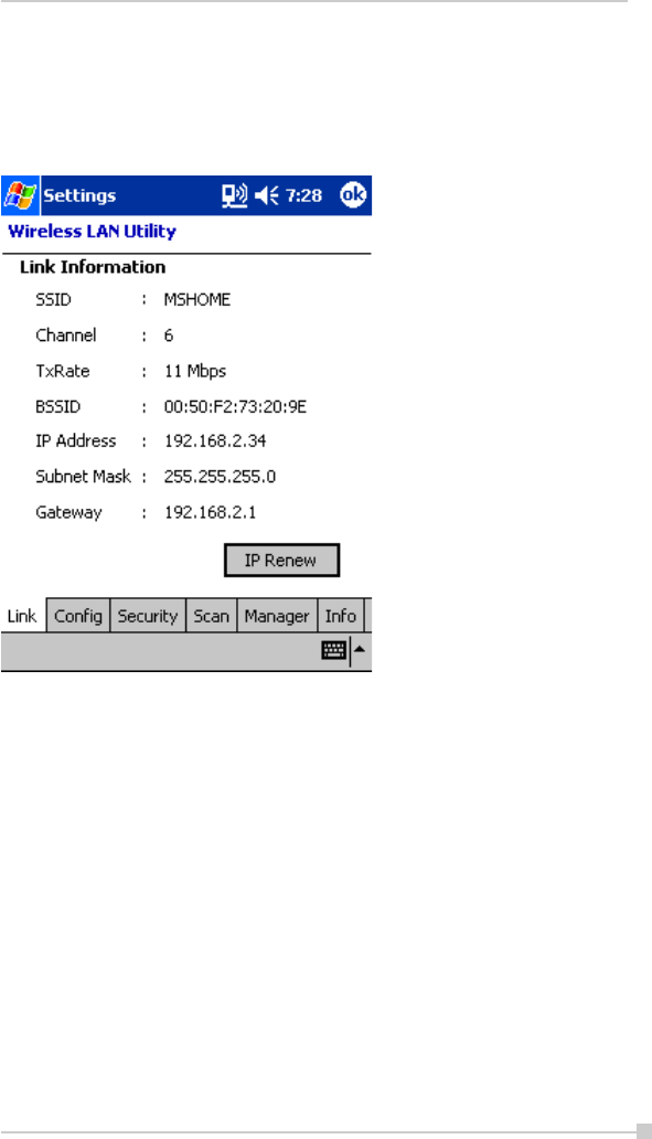 Use the Link page to view SSID, Channel, TxRate, BSSID, IP Address,