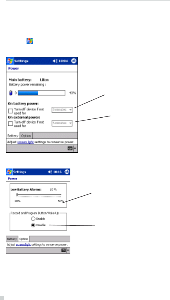 3. Select Battery tab to adjust when battery alarm will come on, and to