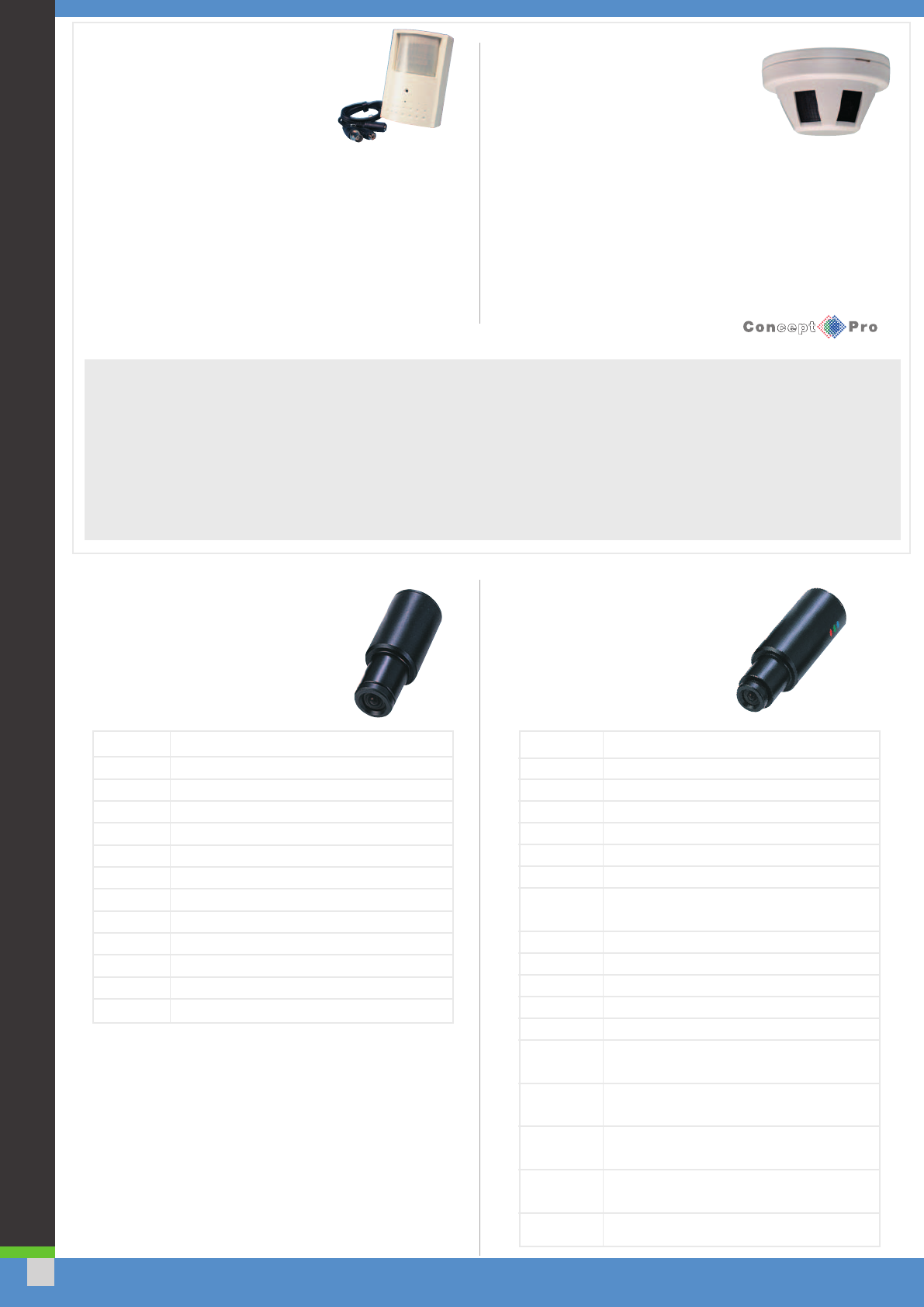 1/3” 420 line 0.05 lux @ F2.0, 3.7mm conical lens, 9-15V DC, Ex-View
