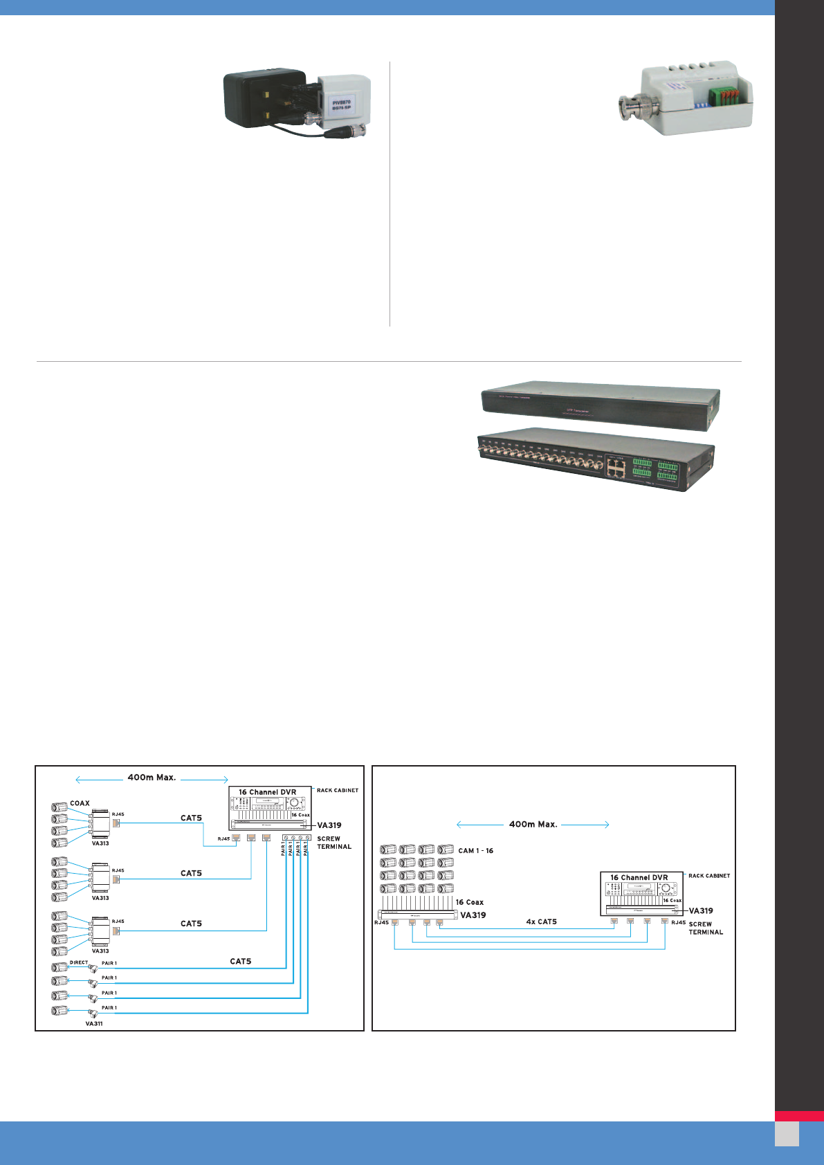 The VA319 is a 1U 19" rack mount 16 way passive balun solution and provides a neat, power free solution for running up to 16 camera