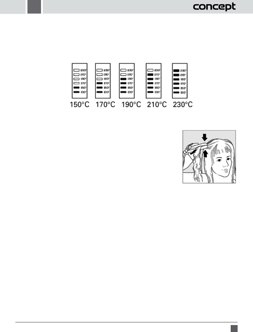 - Sevřete žehlicí desky (4) spotřebiče a táhněte jím pomalu od kořínků ke