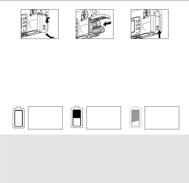• Press the Battery/Memory Card door, slide the door down and lift it open.