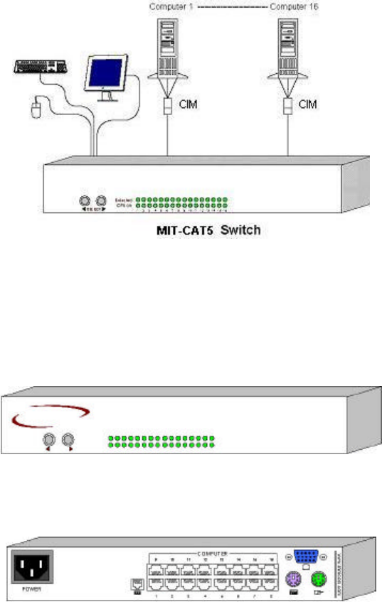 The figure below illustrates the rear panel of the CAT5 KVM 16 port unit. The 8 port model is the