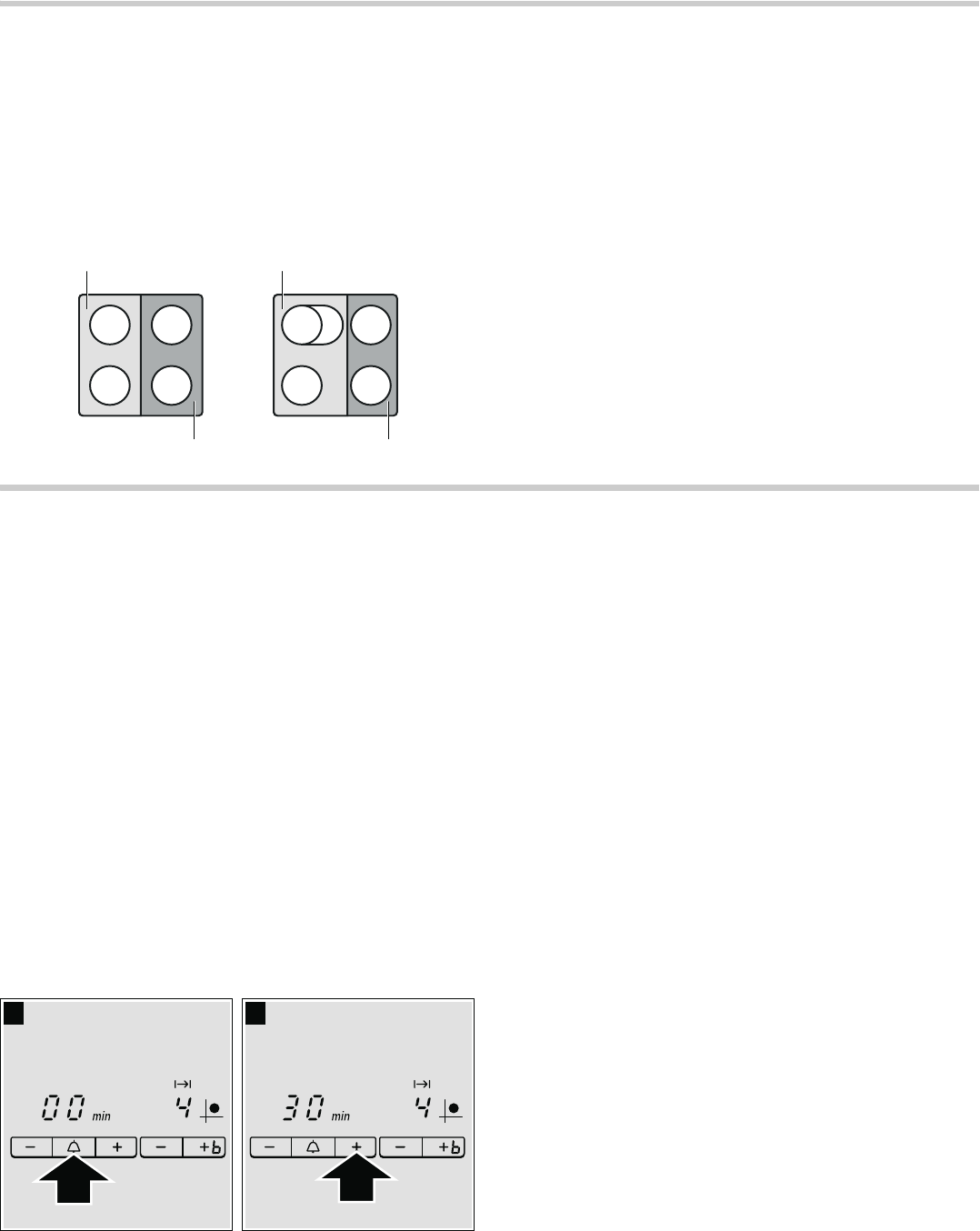 - Diese Funktion kann für alle Kochstellen immer dann aktiviert werden, wenn die andere Kochstelle derselben Gruppe nicht in Betrieb ist (siehe Abbildung). Andernfalls blinken in der Anzeige der ausgewählten Kochstelle › und Š; Anschließend wird ...