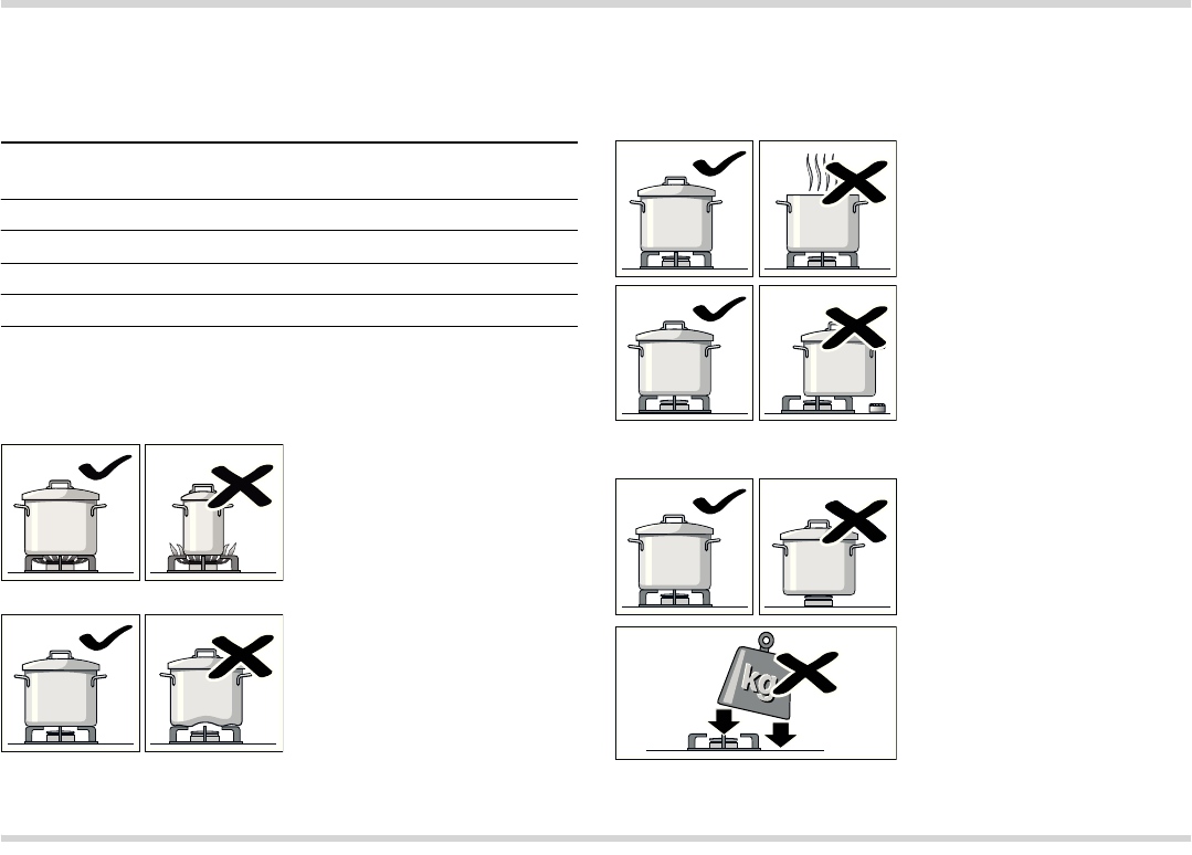 - Kogegrej, der udviser skader, har en uegnet størrelse, støder på kanterne af kogesektionen eller er forkert placeret, kan resultere i alvorlige læsioner. Overhold råd og vejledninger om kogegrej til madlavning.